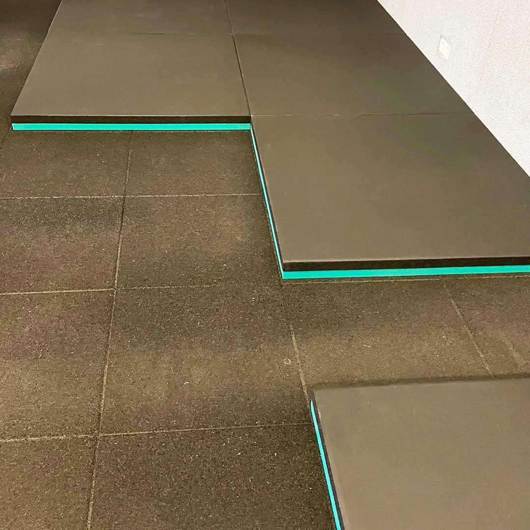 Der erste akustische Bodenbelag, der integral in unabhängigen 1qm-Modulen verlegt wird und dabei eine maximale Isolierung der durch fallende Gewichte in Fitnessstudios verursachten Vibrationen und Geräusche erreicht.
